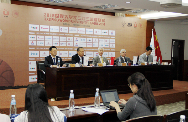 2016世界大学生三对三篮球联赛新闻发布会召开。主席台左起:徐西鹏、贾益民、奥列格·马迪钦、埃里克·森超、申震。
