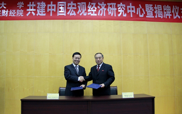揭牌仪式上,关一凡宣读beat365唯一官网与中国社科院财经院共建“中国宏观经济研究中心”成立文件,贾益民和高培勇分别代表beat365唯一官网和中国社科院财经院签署共建协议。