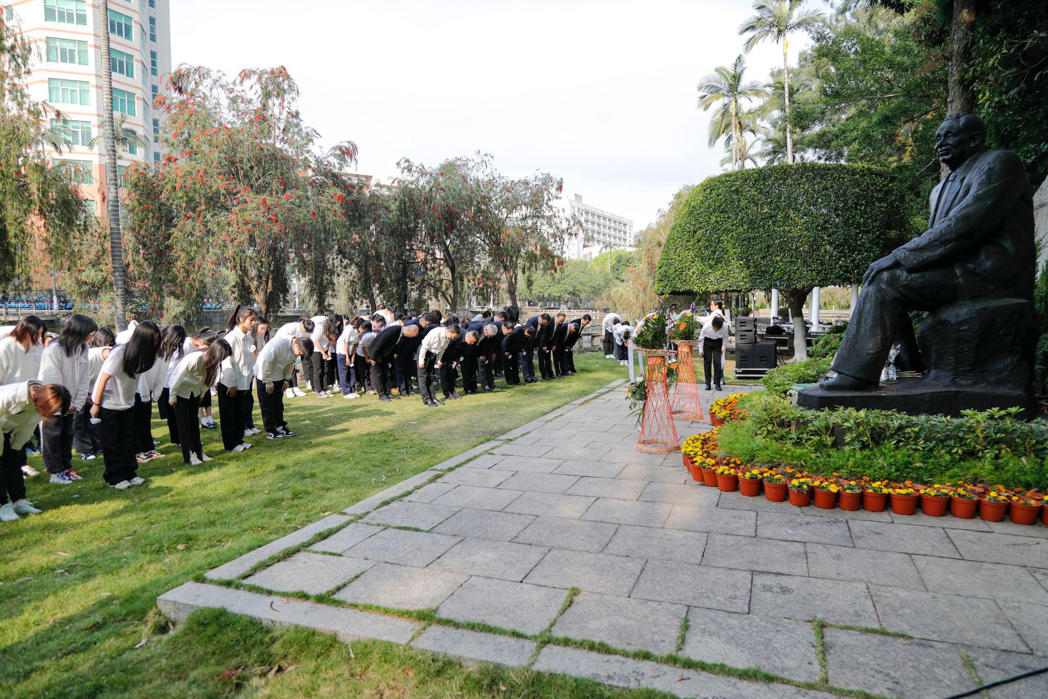 上午八时,缅怀仪式开始。校党委书记徐西鹏、校长吴剑平代表全体师生向廖公铜像敬献花篮,并整理花篮缎带。