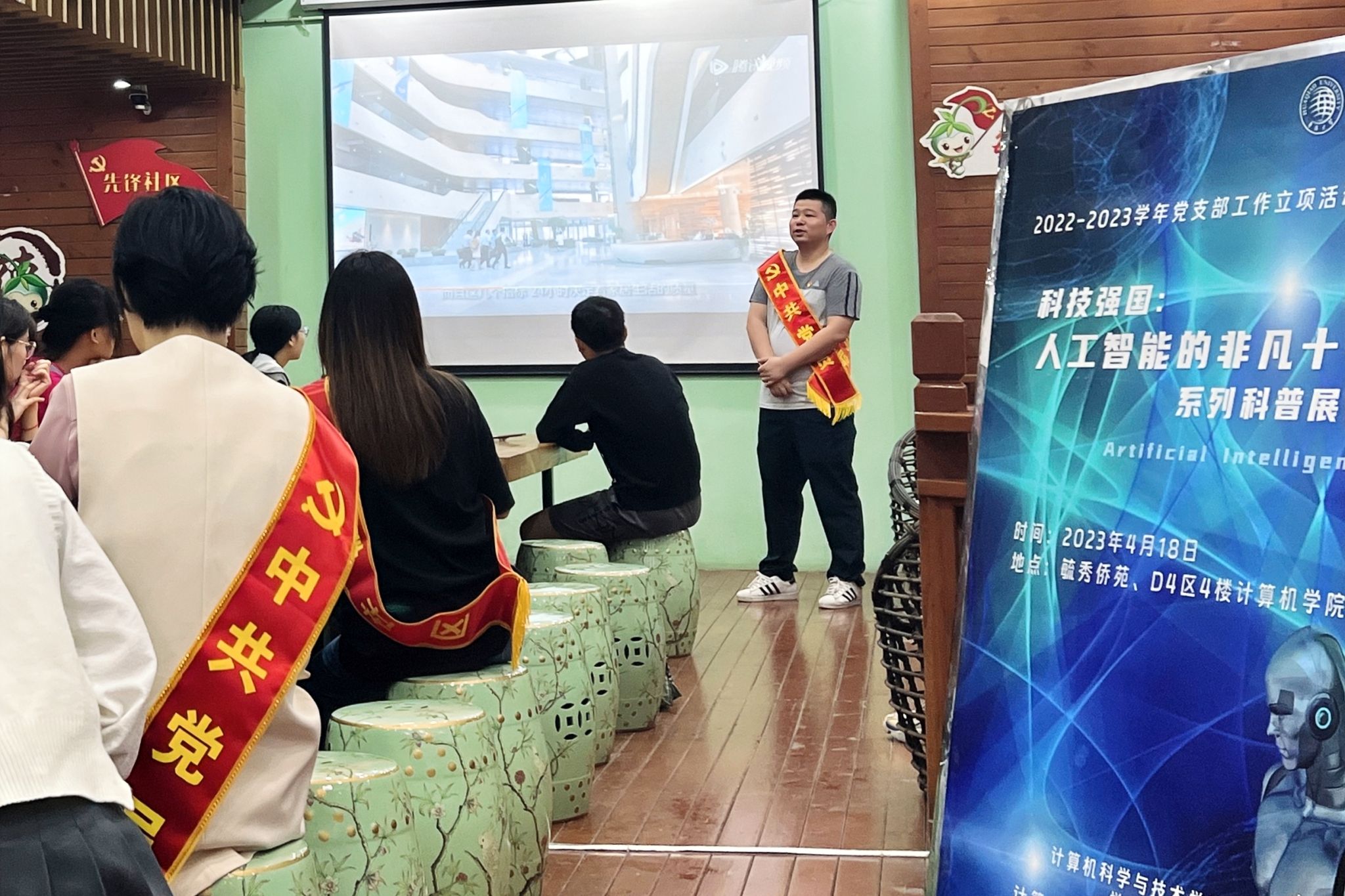 这是由计算机学院本科生第四党支部、教工人工智能系党支部、学生社区凤凰苑2号楼B栋党支部联合举办的“科技强国:人工智能的非凡十年”科普活动现场。4月18日,活动以科普展览、快闪课堂、露天纪录片等形式在校内开展,为师生奉上一趟人工智能科普的知识之旅。