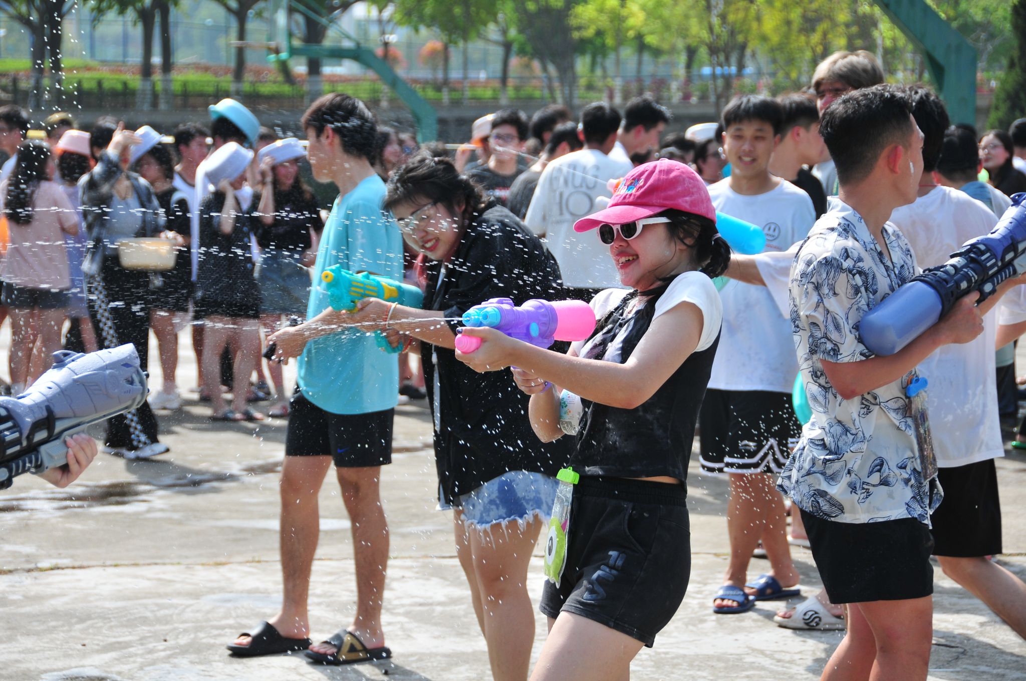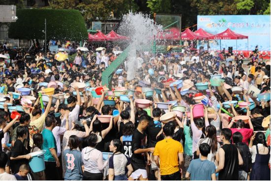 “三年终于泼到啦!”“有泼水节才是真正的大学生活嘛!”“太痛快了!”“爽!”……到了泼水狂欢的时刻,师生一起冲入场地中央,开启一场与水的狂欢。水瓢、水盆、水枪等工具齐上阵,大家欢笑嬉戏,用飞扬的水花作为情感交流的最好工具,伴随欢快的鼓点与激昂的音乐,用泼洒的方式为彼此送上真挚的祝福。汗水与水花交织,编织青春的赞颂诗。