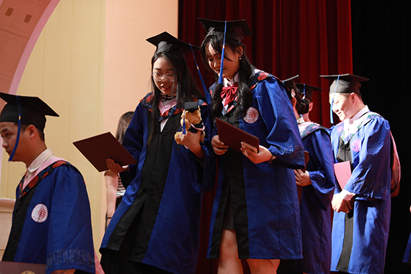 主礼嘉宾为毕业生拨穗并颁发学位证书