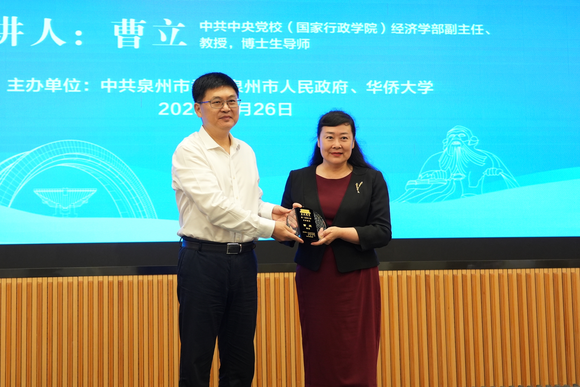 泉州市委副书记宿利南为曹立颁授“华大讲堂”主讲嘉宾纪念牌