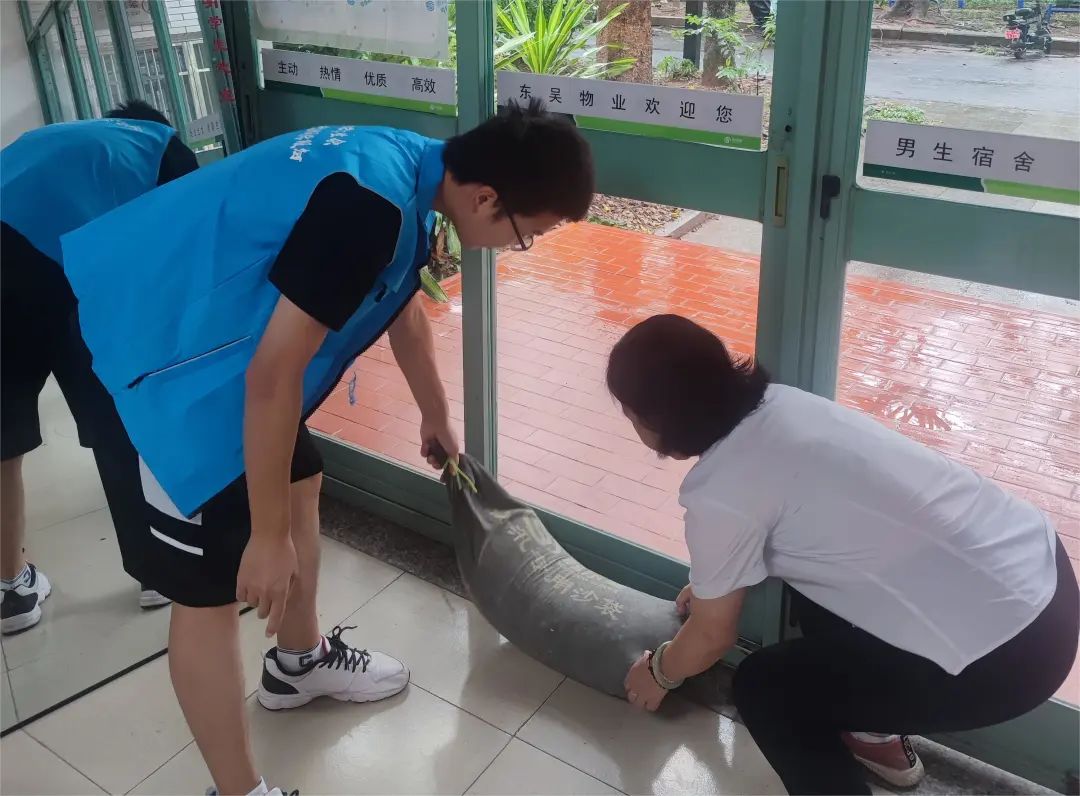 台风登陆前,校级学生组织、学生楼栋党支部、楼栋自律会党员骨干还积极协助楼栋管理员做好台风预警预防工作,为抗击“杜苏芮”台风做好准备工作。