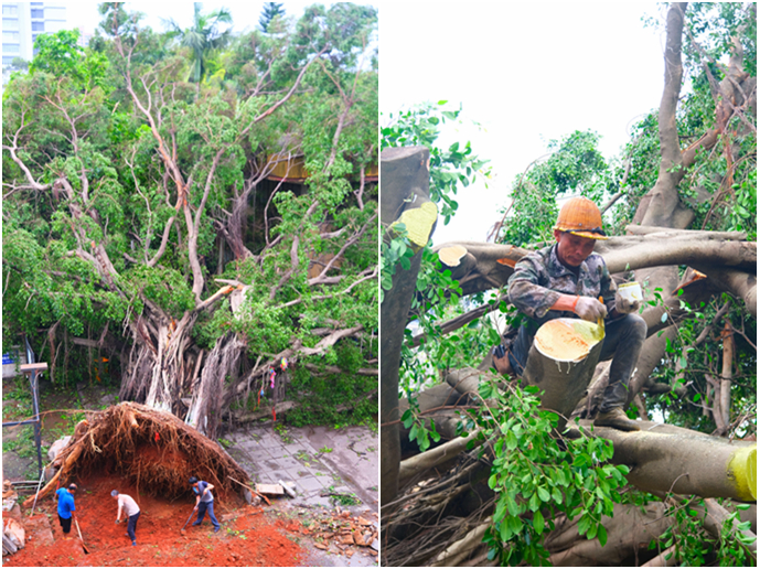 另据学校绿化中心工作人员介绍,本次台风中受伤的诸多树木,如华园大道两侧与学校共同成长的柠檬桉,见证每一届毕业生的凤凰木,深受师生校友喜爱的美丽的异木棉、洋紫荆等,都将陆续接受生命鉴定和治疗。对于被台风吹断的树木,将受伤、受损的枝干截枝即可。而对于部分被连根拔起的树木,则需要专业诊断树木根系的受损情况,若根系保存完整,只需重新种回原地,在短期内对其“挂瓶”治疗,并在三个月内加强补充营养。其中,行道树、绿化树从产地移入后,只能一次种植,不能移动。若受伤的树木还有成活的几率,将立即原地种回。