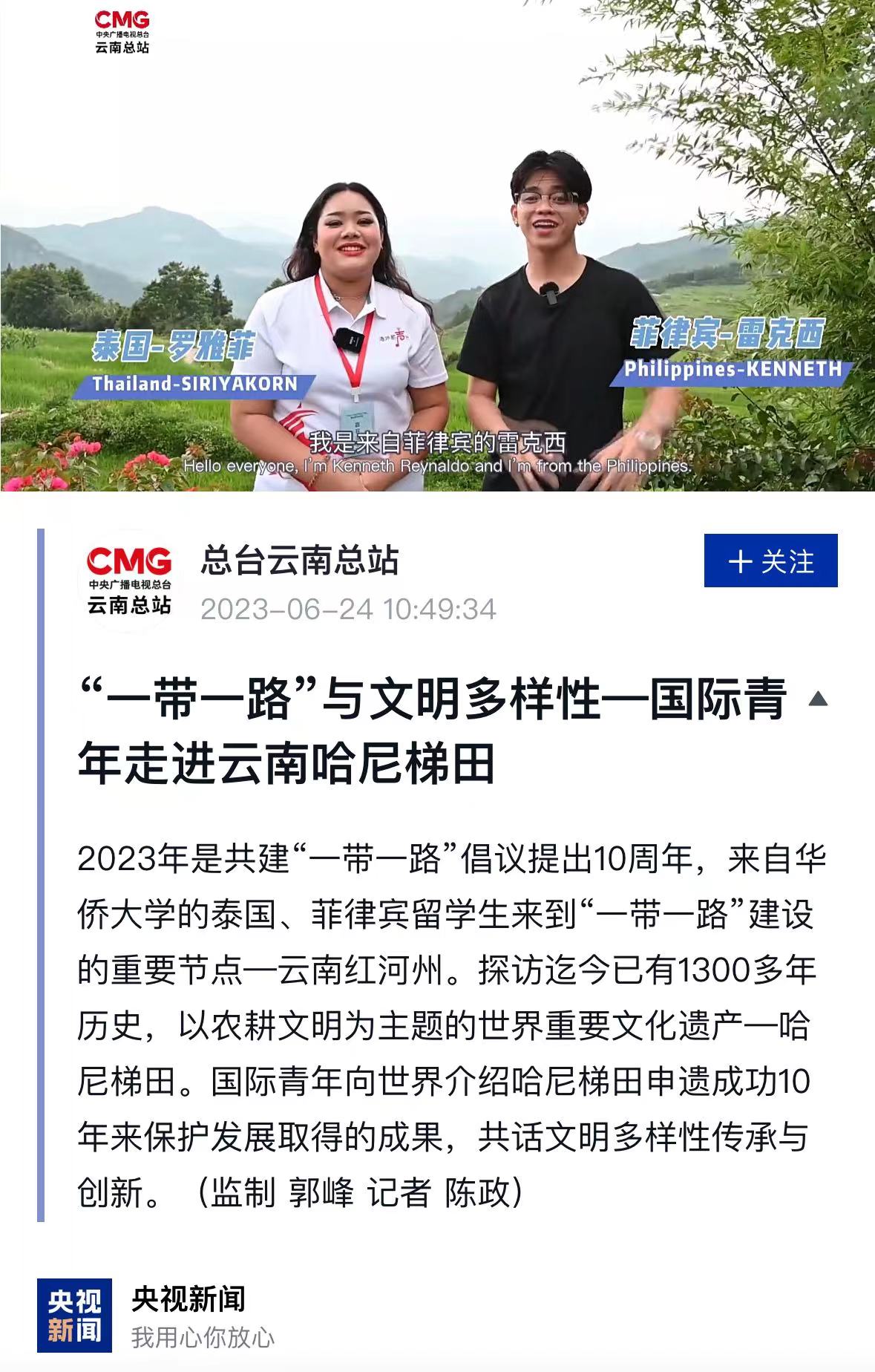 《“一带一路”与文明多样性——国际青年走进云南哈尼梯田》在央视新闻网站播出