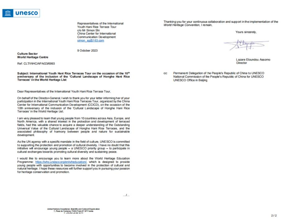 日前,他们收到了联合国教科文组织世界遗产中心主任拉扎赫·伊伦都·阿索莫(Lazare Eloundou Assomo)代表总干事奥黛丽·阿祖莱的回信,信中写道:“在‘国际青年中国行·红河’参访活动中,各国青年们对红河哈尼梯田文化景观所体现的突出普遍价值有了更加深刻的认识,对促进可持续发展理念、人与自然和谐共生思想有了更加深刻的领悟。”阿索莫同时鼓励年轻人多多参与文化交流、促进文化多样性与维护和平。