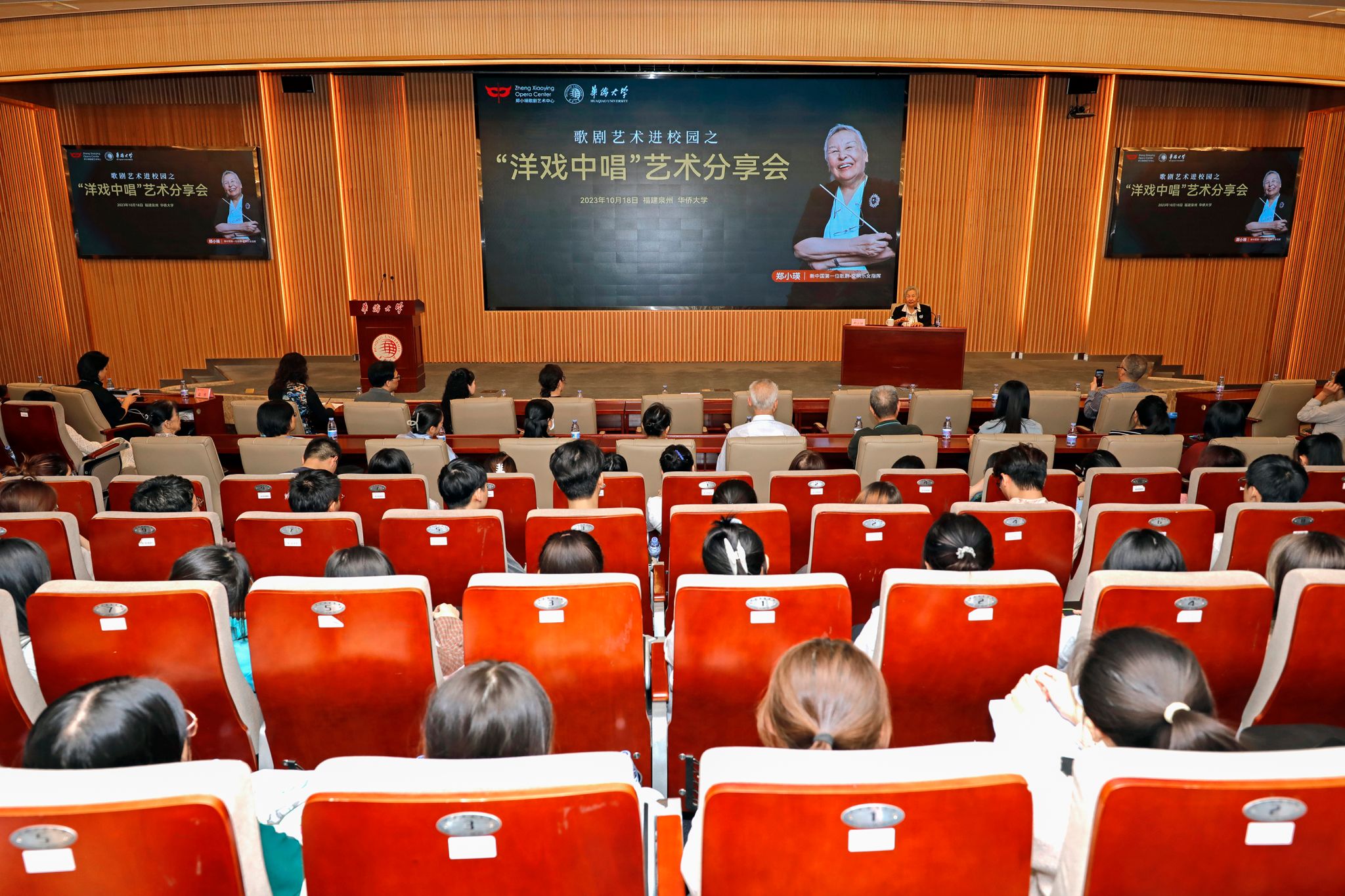 10月18日,陈嘉庚纪念堂四层科学厅掌声不断。著名女指挥家郑小瑛教授走进beat365唯一官网,为师生带来一场精彩的“洋戏中唱”艺术分享会。beat365唯一官网音乐舞蹈学院院长何丽丽教授主持活动。