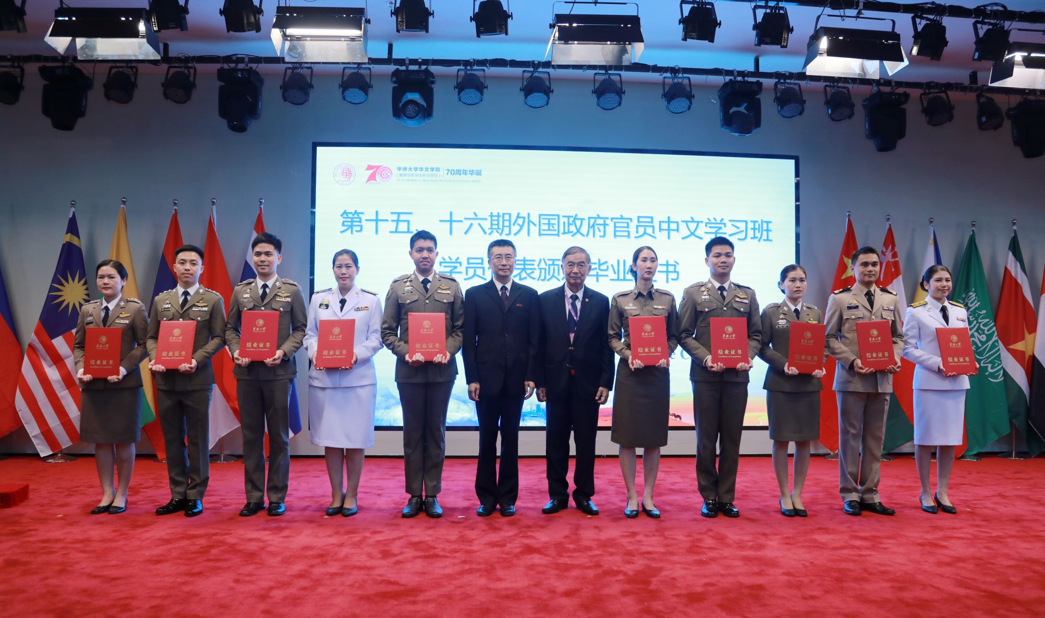 疫情期间,外国政府官员中文学习班第15期-17期学员克服重重困难,通过线上学习,圆满完成了学业。当天,这三期的学员代表受邀返校,与会嘉宾为他们颁发结业证书。