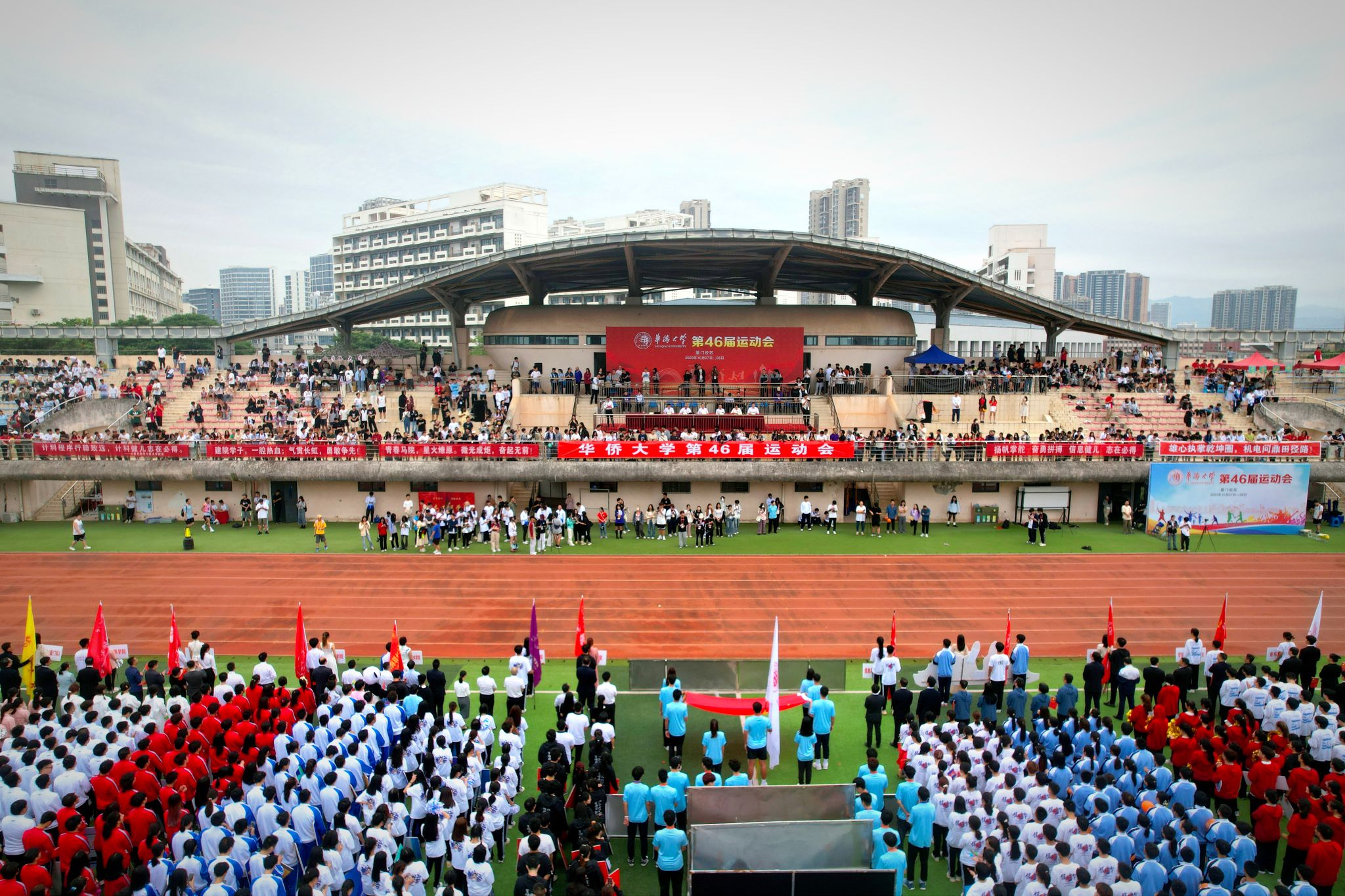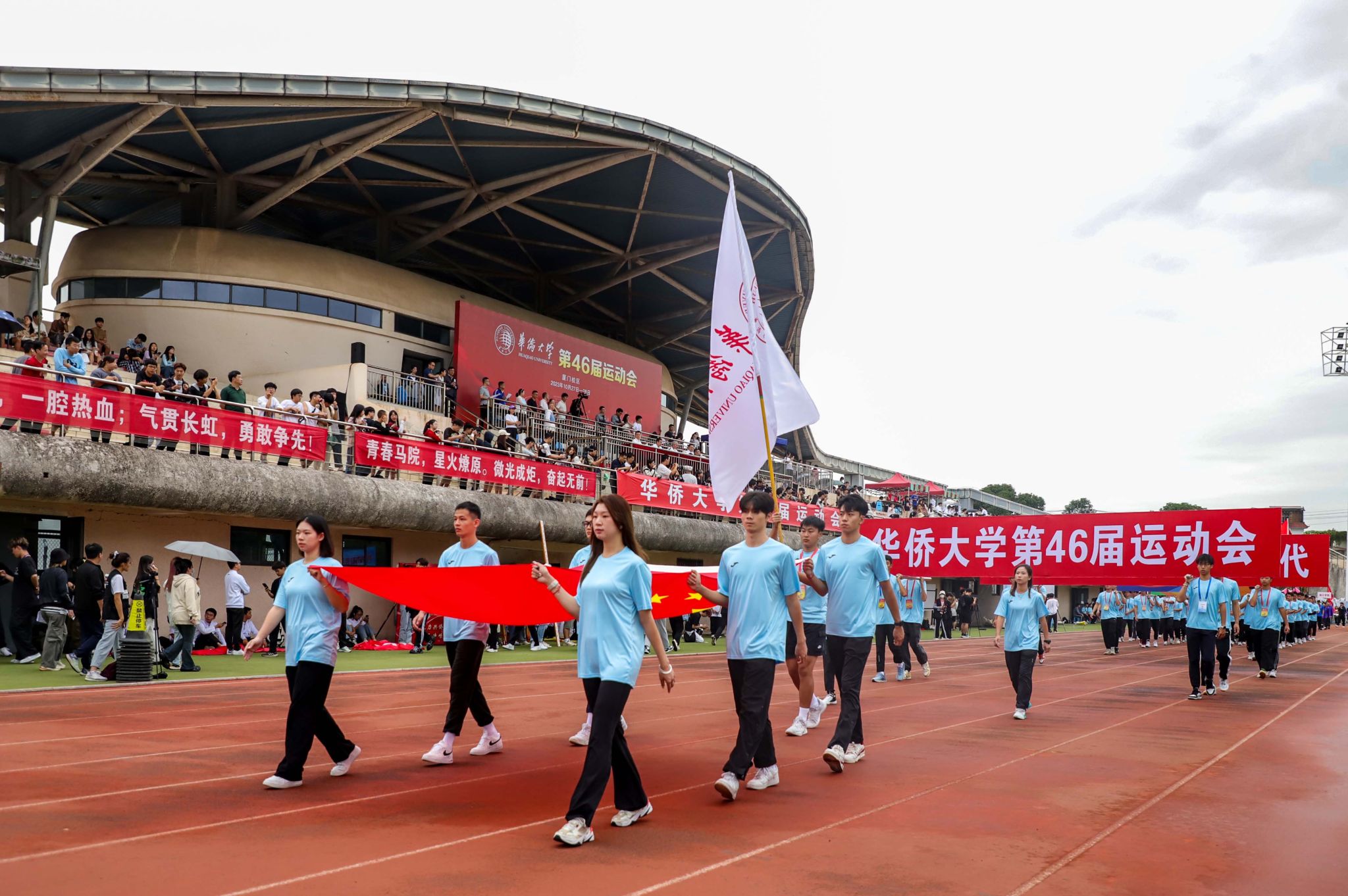 开幕式上,厦门校区各学院以及机关工会代表队组成的15个方阵有序进场。他们步履坚定,整齐划一,口号铿锵,神采飞扬地向着主席台走去,展示了华大人奋发向前的精神风貌。