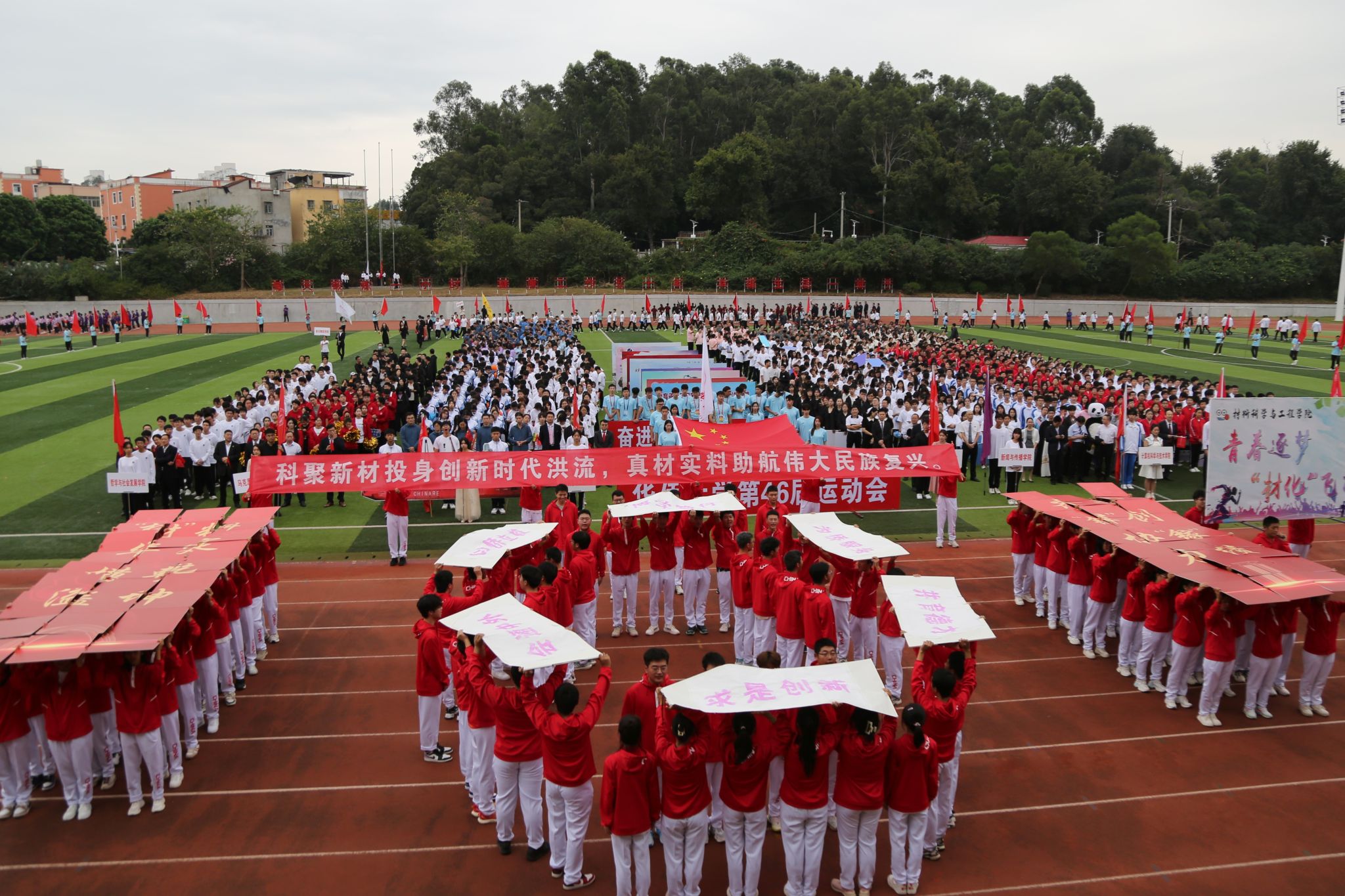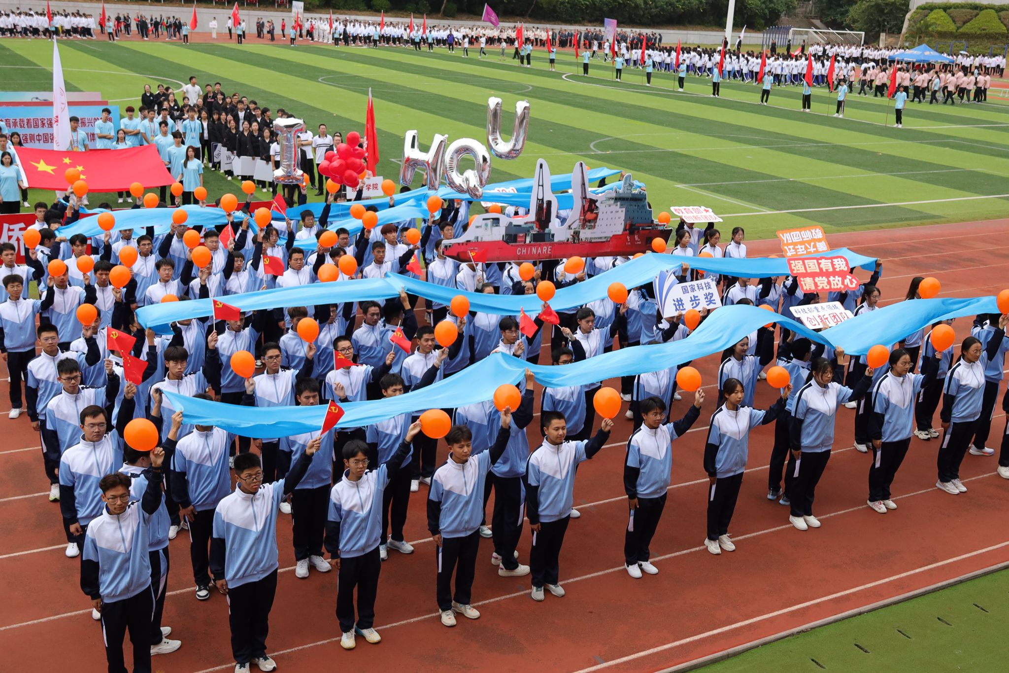 机电学院用“我爱HQU”气球满载学子们的祝福,深情告白华大;材料学院结合学科特点,运用化学原理,现场展现出“会通中外、并育德才”学校办学理念字样;音舞学院舞动《同爱同在》,延续亚运会精神,期待与各院系共享赛场的精彩……今年恰逢“一带一路”倡议提出十周年,华文学院各国留学生挥舞着本国国旗,表达“ ‘一带一路’我带路,大道同行向未来”的美好心愿;信息学院、计算机学院、新传学院、土木学院等结合专业特色,展现出愿为共建数字“一带一路”、绿色“一带一路”贡献力量的愿望。