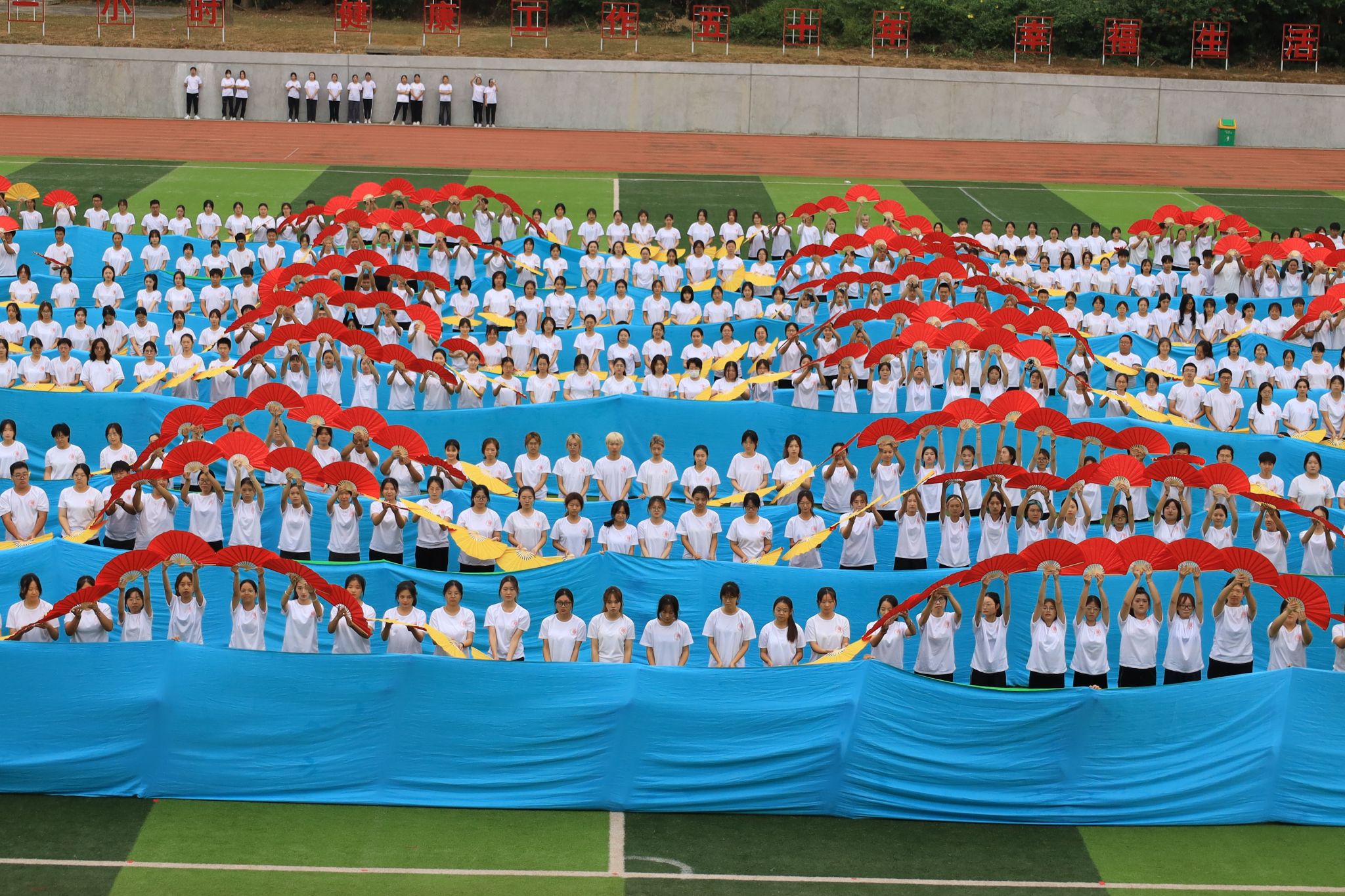 文体表演环节,武术协会的师生手持太极扇,展示了中国传统武术文化的独特魅力;大型表演操中,1000名华大学子手持彩扇,摆出“华大”二字造型,表达对学校的爱恋;学校啦啦操街舞队表演《我和我的祖国》,散发出华大学子的激情与活力,表达对祖国母亲的爱和美好祝愿。