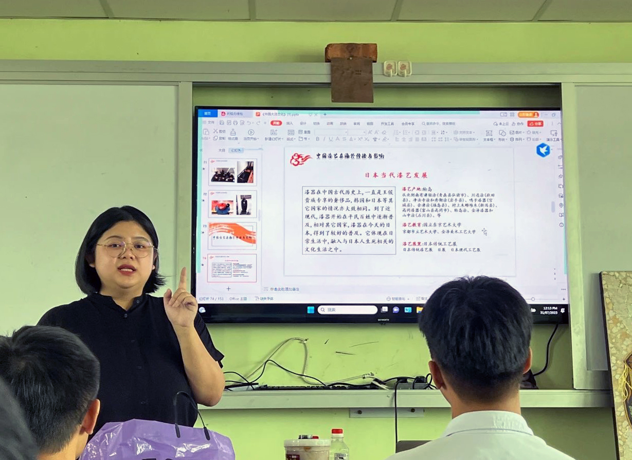 今年暑假,萧荷汶回到母校马来西亚诗巫公教中学,开展了一场介绍中国大漆文化的主题宣讲。她向自己的老师和学弟学妹们详细讲解大漆文化的丰富历史和独特性、艺术性,及其文化遗产价值。热情的宣讲感染了在座的观众,许多马来西亚师生产生了对漆艺的兴趣,萧荷汶与大家热情交流。