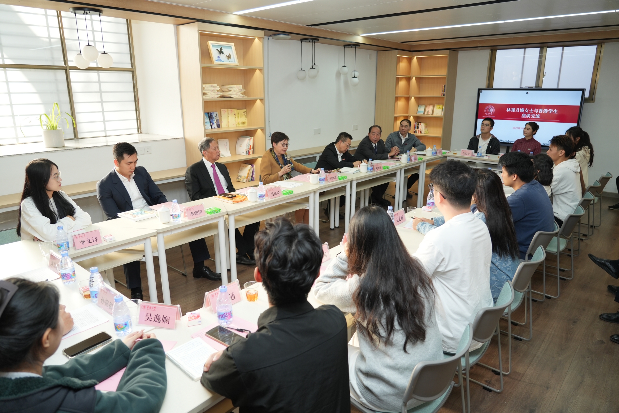 当日下午,在侨缘双向空间听语轩,林郑月娥与在校香港学生代表座谈交流,听取他们在华大的学习生活情况汇报。她对同学们的在校学习规划、未来就业等方面提出建议,并鼓励大家,“你们要发挥‘比内地学生更了解香港、比香港学生更了解内地’的优势,把在祖国、在华大学习到和感受到的优秀文化传承好、发扬好”。