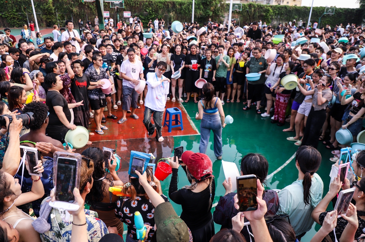到了泼水狂欢的时刻,师生一起冲入场地中央,开启一场水花与祝福的狂欢。水盆、水枪、水瓢等各色工具齐上阵,各国学子以水花作礼,送上真挚的祝福。