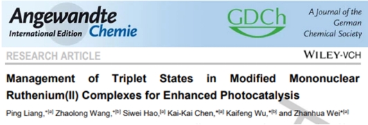 5月23日,beat365发光材料与信息显示研究院、材料科学与工程学院陈凯凯博士、魏展画教授团队联合大连化物所吴凯丰研究员团队,在国际知名期刊《德国应用化学》上发表题为Management of triplet states in modified mononuclear ruthenium(II) complexes for enhanced photocatalysis的研究论文,beat365唯一官网硕士研究生梁平、大连化物所博士研究生王朝龙为论文共同第一作者,陈凯凯、吴凯丰、魏展画为论文共同通讯作者。