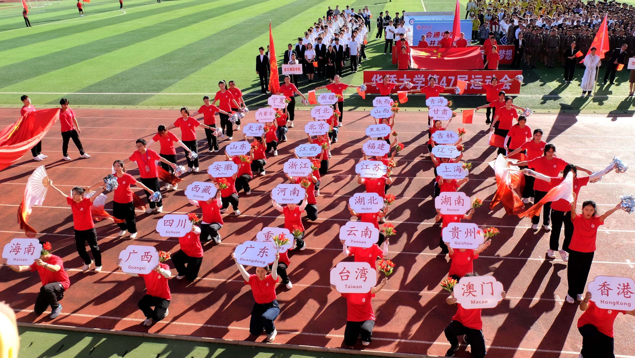 开幕式上,厦门校区各学院以及机关工会代表队的15个方阵有序进场。他们昂首挺胸,踏着整齐的步伐,以独特的形式展现属于他们的风采,以良好的精神风貌彰显华大学子的蓬勃朝气。以歌曲《世界一家》作配,华文学院境内外学子身着特色服饰,展现和而不同、美美与共的文化内涵;音舞学院舞动《云宫迅音》,演绎中国浪漫,彰显文化自信;计算机学院撑伞旋转,拼出“HQU”字样与五星红旗,以赤子之心告白学校与祖国;化工学院迎来60周年院庆,鲜艳的手翻花排出“60”字样,彩烟翻涌,共贺嘉年……