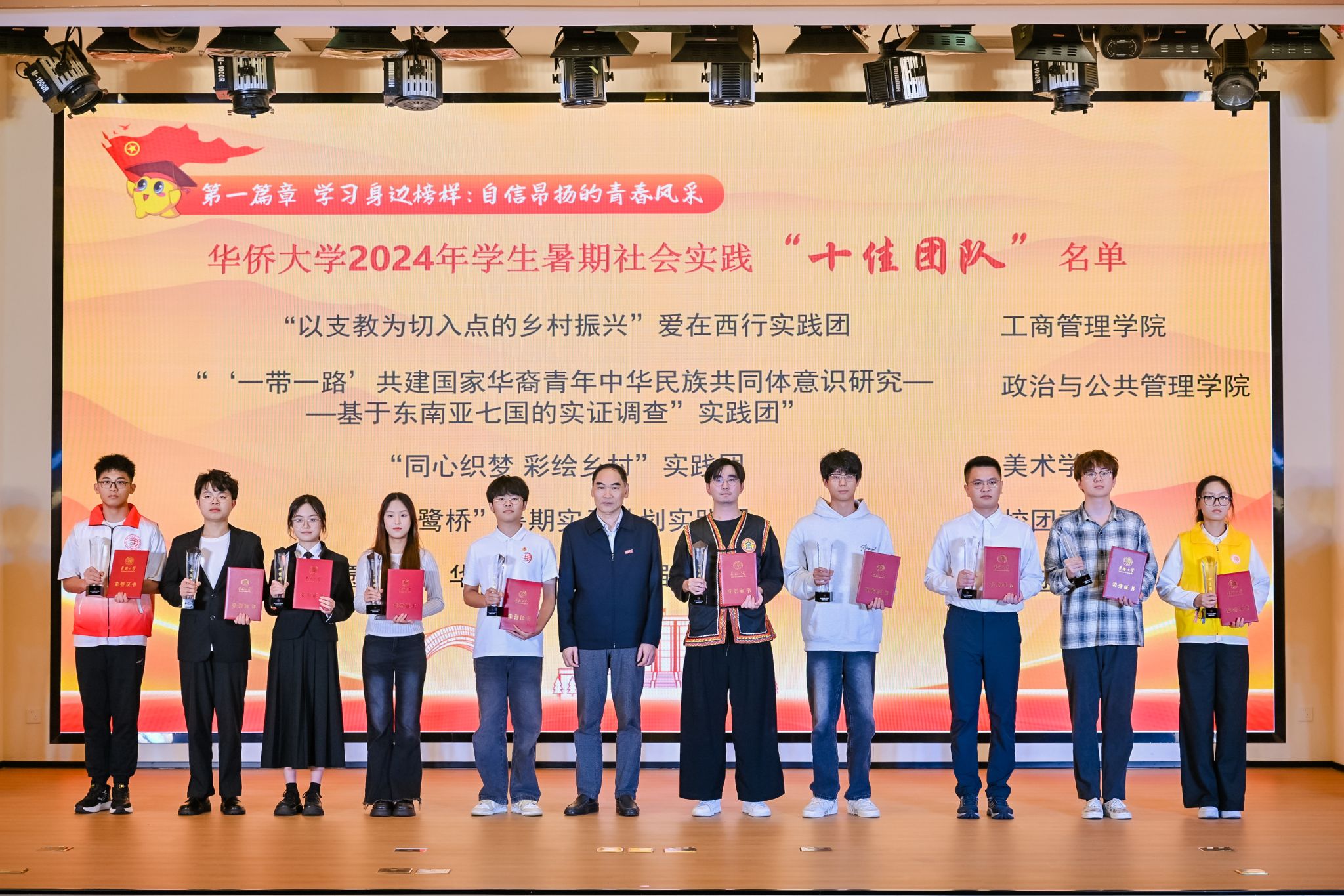 活动分为三个篇章。在“学习身边榜样:自信昂扬的青春风采”篇章,活动表彰了beat3652024年学生暑期社会实践活动的优秀个人、成果和团队。张佳慧等10名暑期社会实践先进个人学生代表、陆文千等10名暑期社会实践先进工作者教师代表、《嘉庚精神在中国及东南亚国家的传承传播现状调研》等10个暑期社会实践优秀成果的代表、“政务心实践团”等10个暑期社会实践优秀团队的代表和“beat365唯一官网桑梓树下支教实践团”等暑期社会实践十佳团队获表彰。