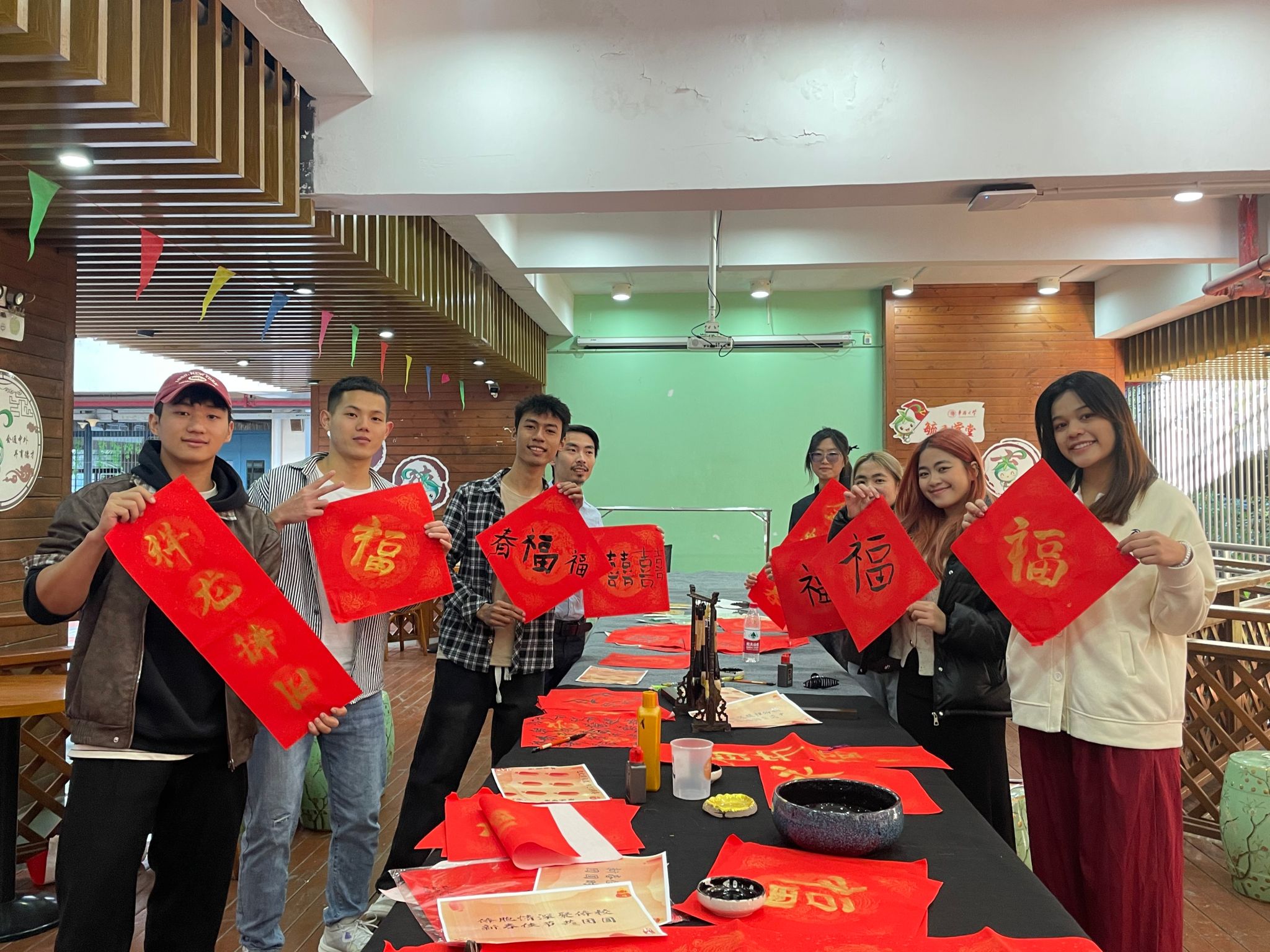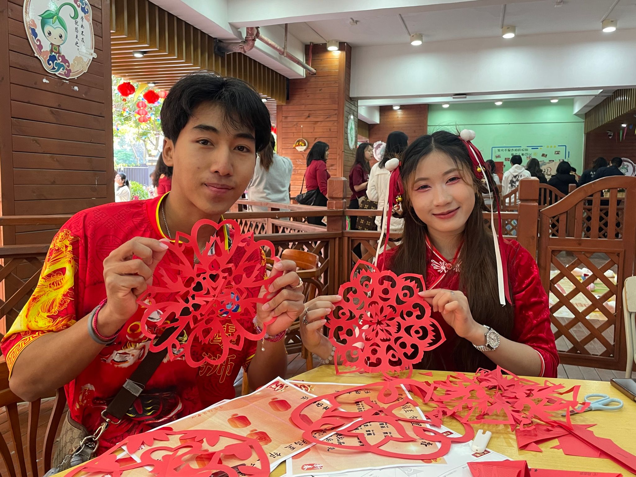 伴随着清脆的“咔嚓”声,一张张红纸在同学们手中纷飞,不一会儿就化作福字或者生肖蛇、花鸟等吉祥图案。书法爱好者手持毛笔,饱蘸浓墨,在对联纸上游走自如。“春满侨校承五洲嘉庚薪火,雨润杏坛育四海融贯英才”,工商学院2021级缅甸留学生杨菊馨喜悦地向大家展示刚写的春联。不少同学也拿起毛笔尝试一番,盈盈笑语为新春佳节增添欢乐色彩。
