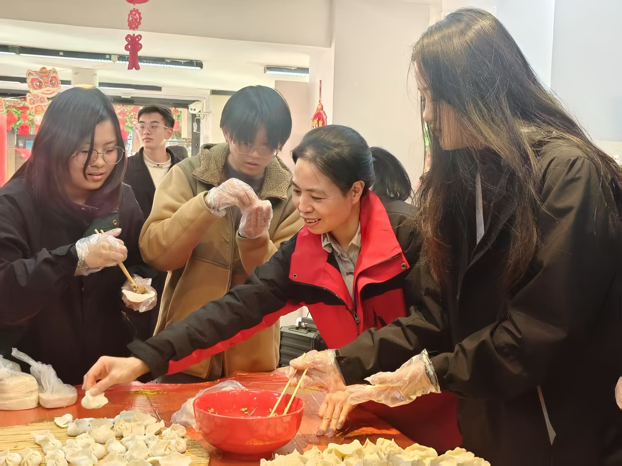 包饺子的长桌前人头攒动。刚学会包饺子的美术学院2023级马来西亚留学生黄一文边示范边笑着说:“大家看,先把饺子皮这样摊开,放上适量馅料,再捏紧边缘,一个饺子就包好啦!”随着一双双巧手的忙碌,桌面上渐渐堆满了圆润饱满、形态各异的饺子,承载着节日的喜悦与邻里的温馨。