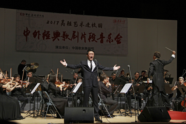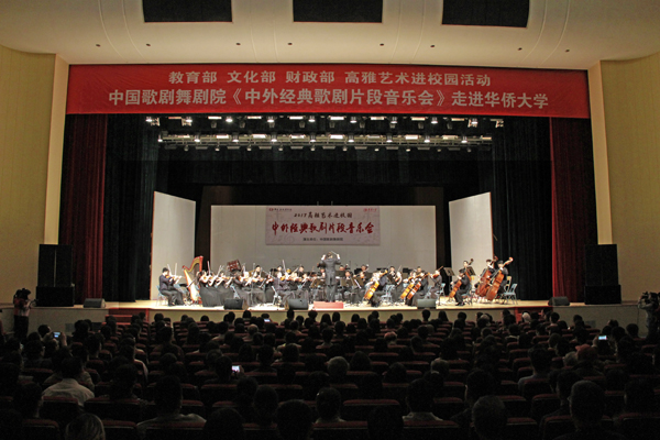 音乐会以《费加罗婚礼》序曲开场。著名歌唱家王燕首先上台演唱了西方歌剧选段《你可知道》,并与青年男高音歌唱家李振涛合唱中国民族歌剧选段《紫藤花》,将现场的气氛带动起来。当由青年歌唱家易文卉演唱的《珊瑚颂》《洪湖水浪打浪》《清粼粼的水蓝莹莹的天》等旋律响起时,许多师生按捺不住心中的激动,都跟着小声哼唱。著名歌唱家朱立群则带来了中国经典民族歌剧《江姐》中的《绣红旗》《红梅赞》选段。