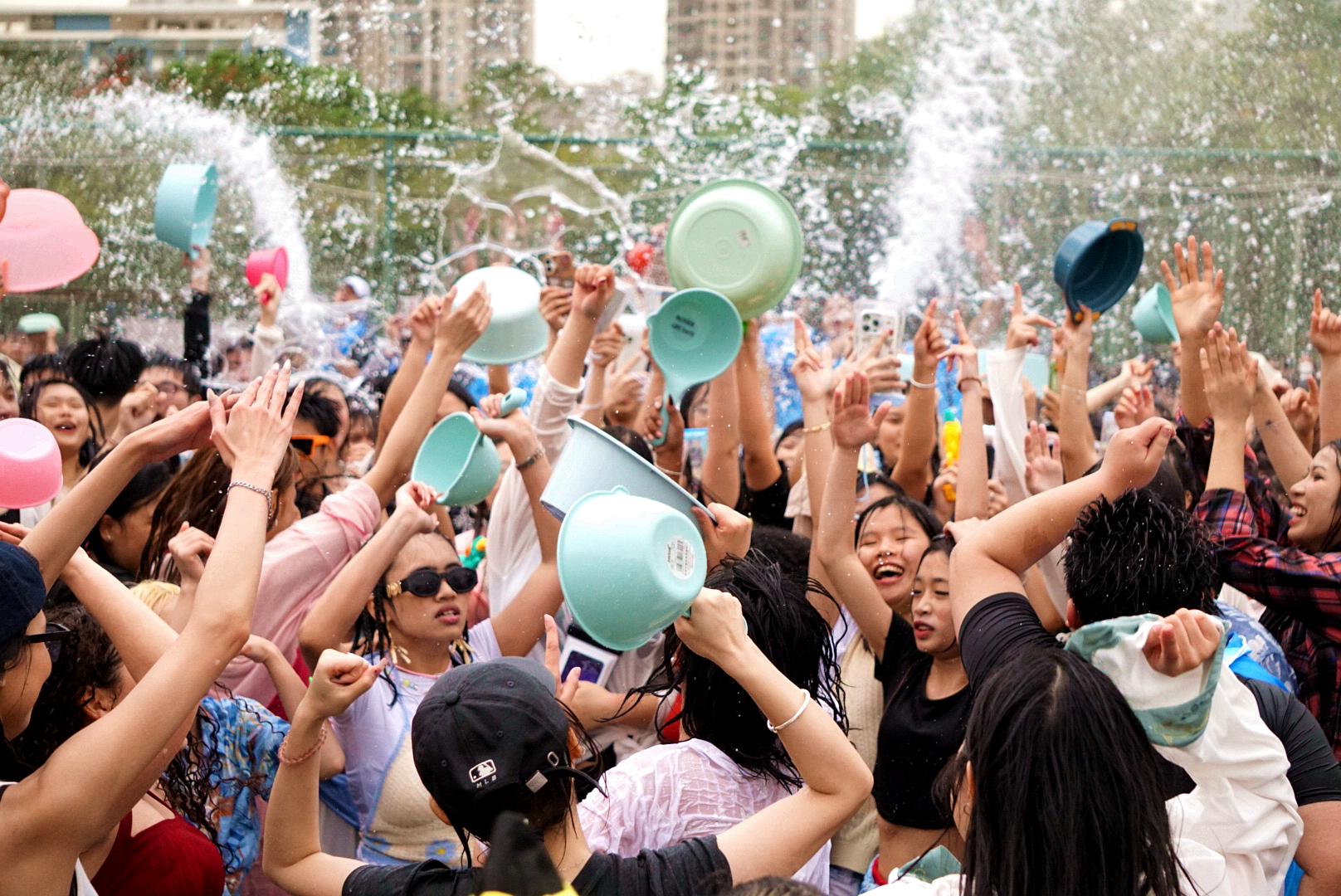 泼天欢乐笑声漾,绵绵祝福情谊长。令人兴奋的泼水时刻到来,现场欢乐氛围达到高潮,师生一起冲入场地中央,开启一场水花与祝福的狂欢。水盆、水瓢等各色工具齐上阵,水珠与笑声在热烈氛围中一同炸开,各国学子扬起水花,互相祝福,增进情谊。
