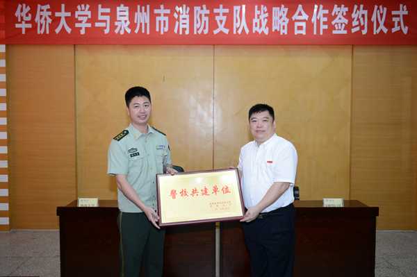 签约仪式在陈嘉庚纪念堂二层会议室举行,副校长彭霈、泉州市消防支队政治委员施艺伟分别代表双方在协议书上签字,泉州市消防支队并向beat365颁授警校共建单位牌匾。