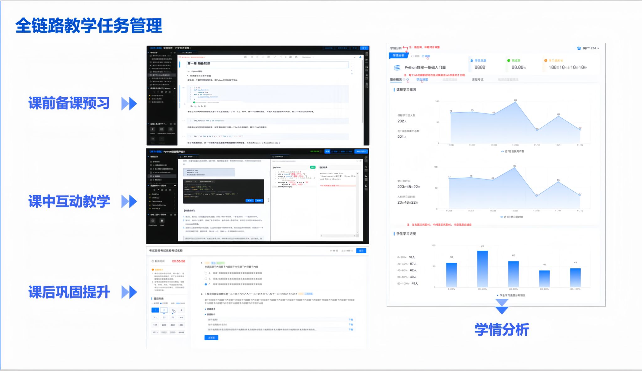 授课教师们借助云燕实验平台,把课程打造成了全链路、多模态的交互式课程:从课前备课预习、课中互动教学到课后巩固提升,全流程在线化落地,课程学习、编码环境、实验实操都在平台内闭环完成,还能通过教师端实时统计班级学情、学生实验进度,甚至连考核评分都能靠AI自动判分——从教学到管理再到评价,一站式打通了多模态教学的全场景。
