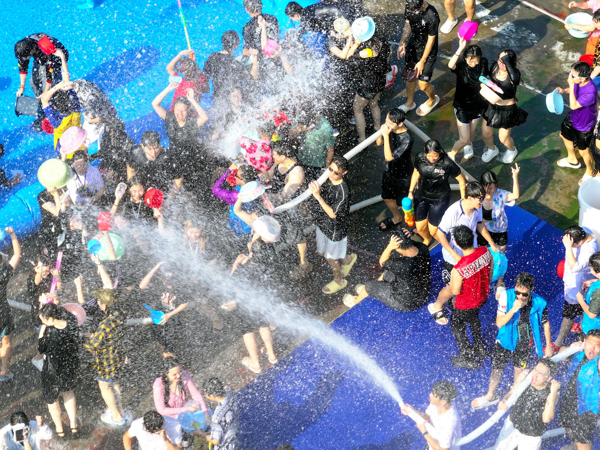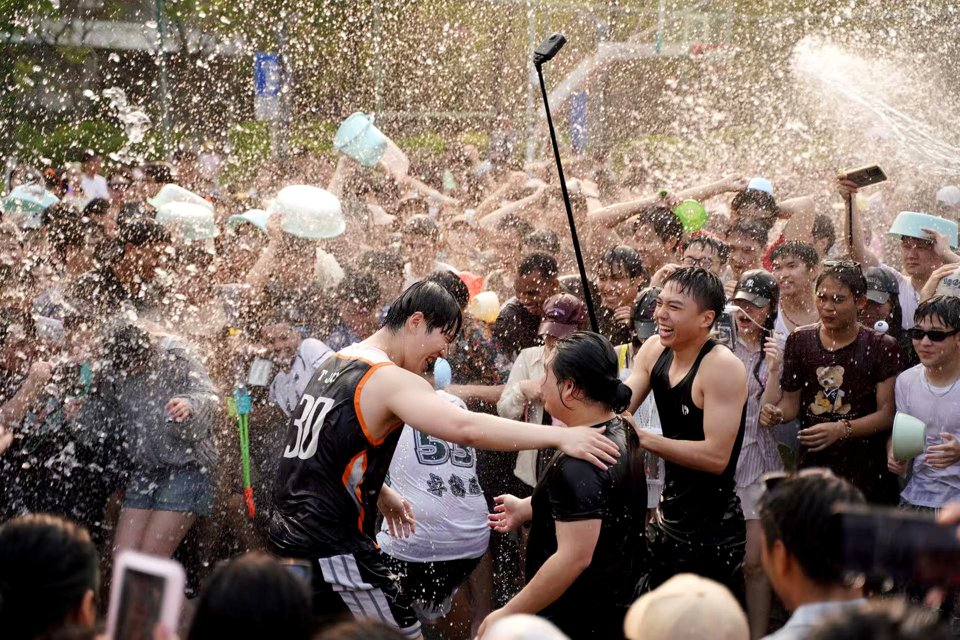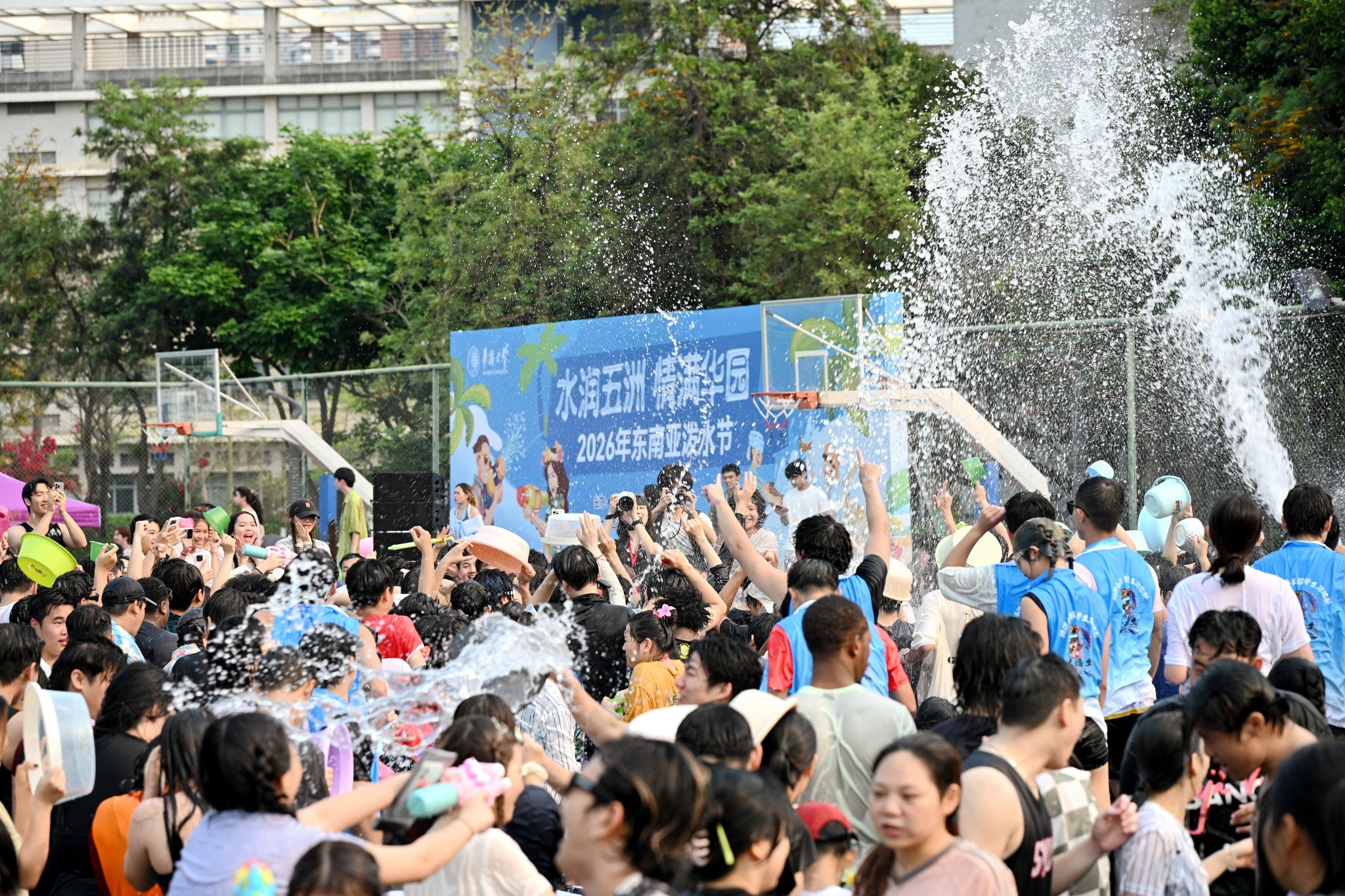 水花翻涌传笑语,清波漫溢载温情。泼水狂欢环节将现场气氛推向最高潮。师生们手持水盆、水枪、水瓢等器具相互泼洒,在飞溅的水花中传递祝福、释放欢乐,欢笑声和水花声交织成一片。