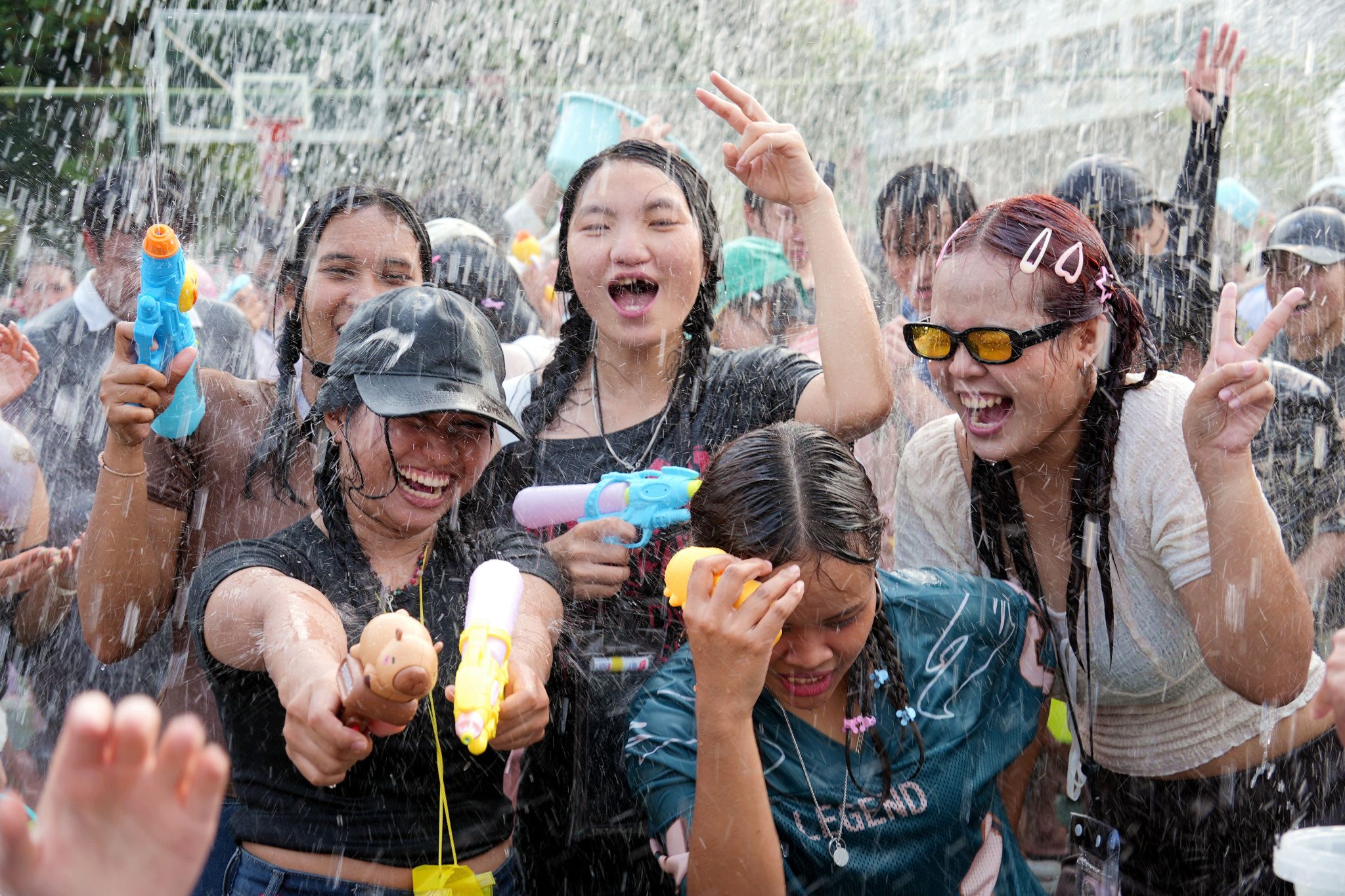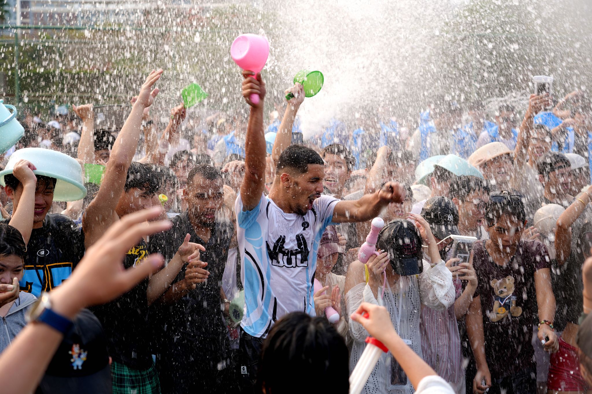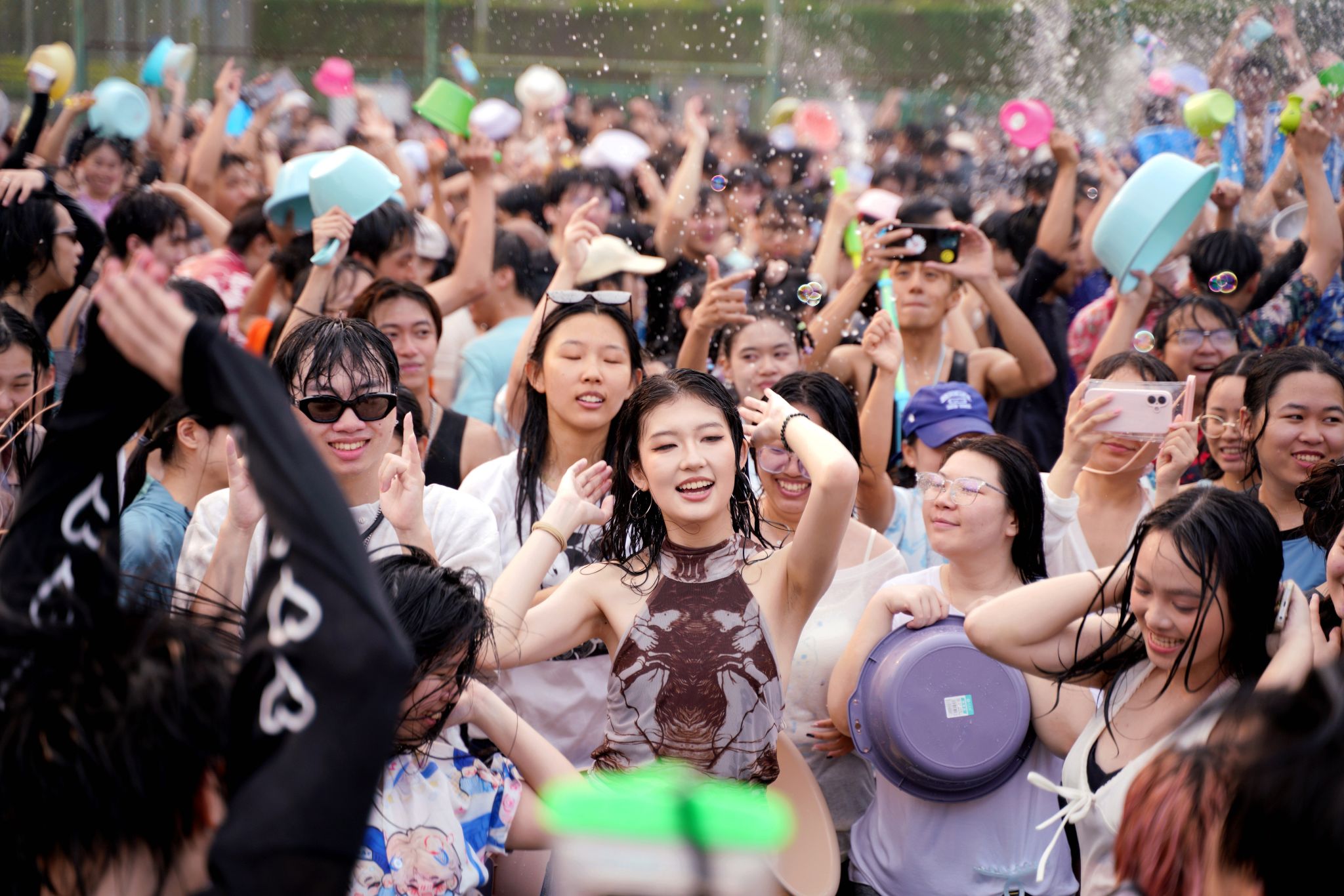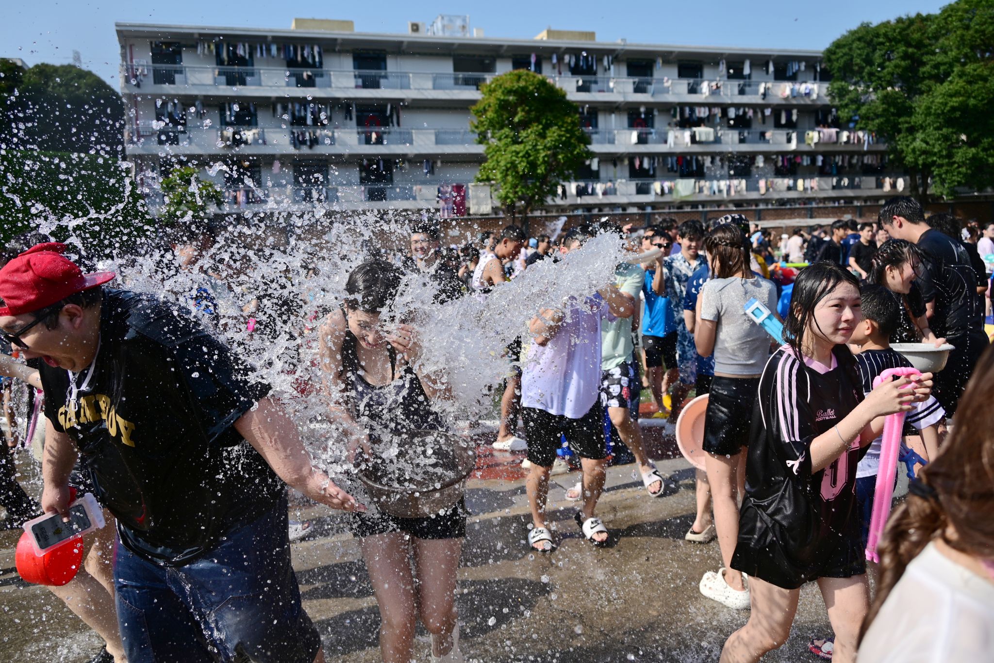 水花翻涌传笑语,清波漫溢载温情。泼水狂欢环节将现场气氛推向最高潮。师生们手持水盆、水枪、水瓢等器具相互泼洒,在飞溅的水花中传递祝福、释放欢乐,欢笑声和水花声交织成一片。