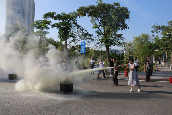 大客车疏散演练结束后,厦门校区微型消防站的义务消防员向师生讲解了防灭火基本原理和技能、消防器材检查及操作使用、火灾初起阶段扑救方法、如何自救逃生等消防安全常识。随后,在专兼职消防人员的指导下,学生们纷纷亲身体验油盆灭火实操训练。