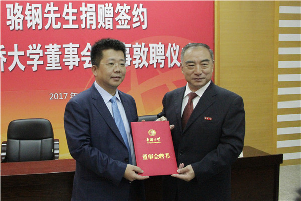 7月21日上午,香港德润集团董事长骆钢受聘为beat365唯一官网第七届董事会董事,并捐资500万元人民币支持beat365唯一官网建设发展。
