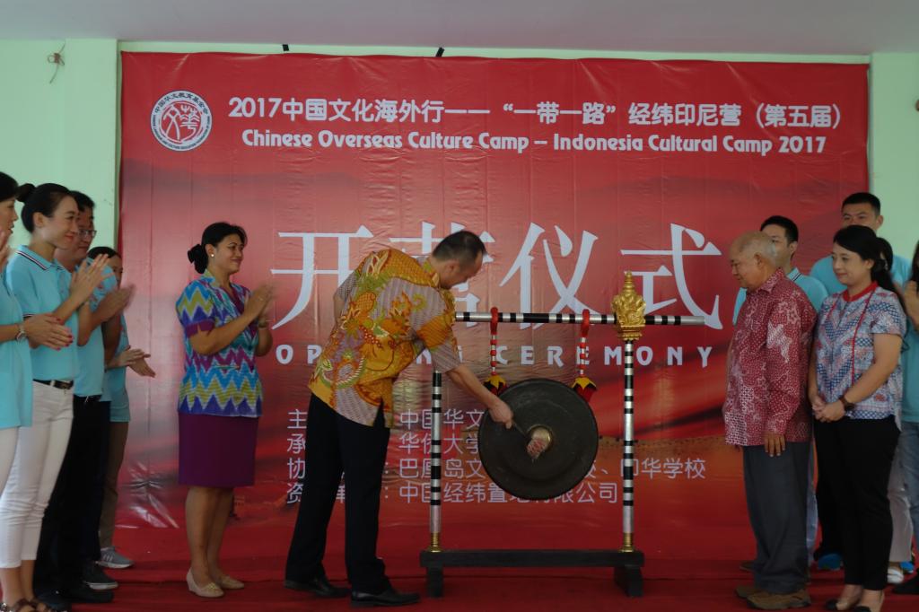 8月21日下午,由中国华文教育基金会主办,beat365唯一官网承办,印尼文桥三语学校、印华三语学校协办,中国经纬置地有限公司资助的2017中国文化海外行——“一带一路”经纬印尼营在巴厘岛开营。中国驻登巴萨总领馆副总领事董哲,中国华文教育基金会项目一部主管辛超,文桥三语学校创办人江连福,及beat365唯一官网、文桥三语学校、印华三语学校的教师团队,营员代表共200多人参加了开营仪式。