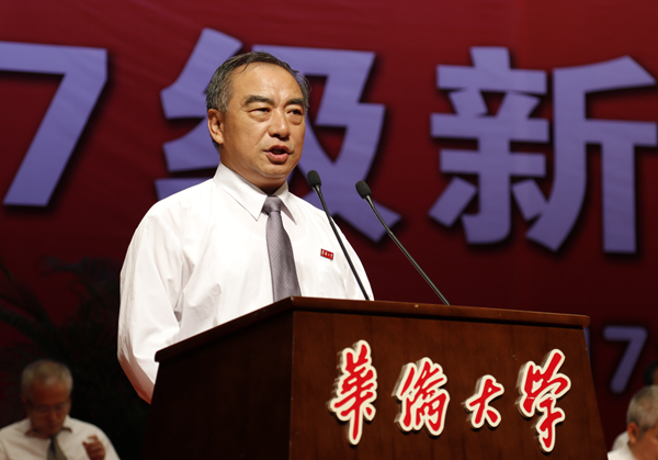 “在华园,你们将与来自世界50多个国家和地区的优秀青年学子相聚相识,互相学习借鉴,一同成长进步……”开学典礼上,校长贾益民作题为《以中华优秀传统文化点燃无悔青春》的讲话,希望同学们做好“大学的主人”,把握人生成长的重要时期、文化自觉形成的关键时期,增强文化自觉和文化自信。他指出,当代大学生应热爱中华优秀传统文化,学习、感受和品鉴传统文化;践行中华优秀传统文化,坚守社会主义核心价值,敢于梦想,崇德修身;弘扬中华优秀传统文化,推动中华文化走出国门、走向未来。