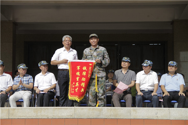 刘斌向承训的解放军73141部队副政委张纪伟赠送写有“铁律励精兵,军魂育英才”的锦旗。参训学生代表、美术学院学生曾泗银向解放军73141部队赠送beat365学生创作的军训画作,表达对教官的敬爱与感激。