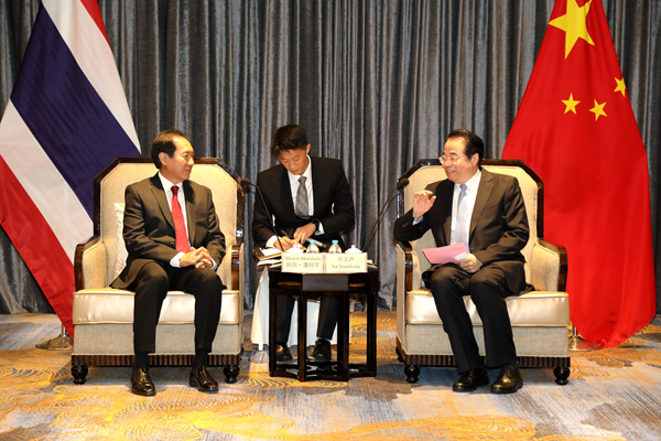 中国国务院侨办党组书记、副主任许又声7日晚在厦门会见出席第六届中泰战略研讨会的泰中文化经济协会会长、前泰国国会主席颇钦·蓬拉军。