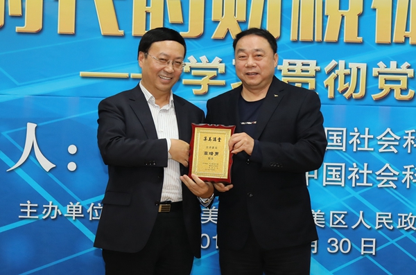 集美区人大常委会主任陈建荣为高培勇教授颁发“集美讲堂”主讲嘉宾纪念牌