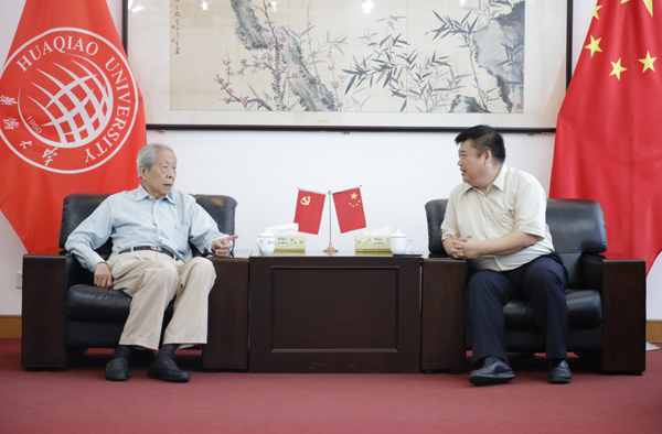 彭霈对施子清伉俪百忙之中专程访问学校表示欢迎,并简要汇报了学校近年来开展的主要工作和近期动态。施子清表示,很高兴再次回到华大,并对华大近年来取得的喜人成绩表示赞赏。在彭霈的陪同下,施子清伉俪一行还参观了其捐建的敬萱堂,并合影留念。