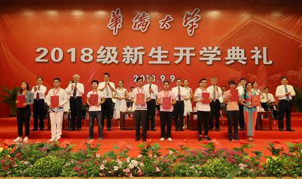 参加开学典礼的部分境外新生在现场合影留念