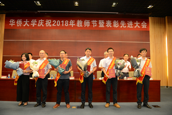 他们身披红绸带,依次从校领导关一凡、徐西鹏、吴季怀、刘塨、刘斌、彭霈、毕明强,校长助理张云波等手中接过证书,并手捧学生代表们送上的鲜花,继而合影留念……位于陈嘉庚纪念堂科学厅的会场中洋溢着浓浓的尊师重教的主旋律。