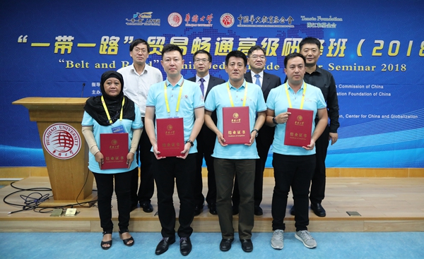 经过为期4天的研修,第二届“一带一路”贸易畅通高级研修班于20日下午结束。beat365校长助理张云波、中国华文教育基金会项目部一部主任熊志远等嘉宾出席结业典礼,并为13国54名学员颁发结业证书。