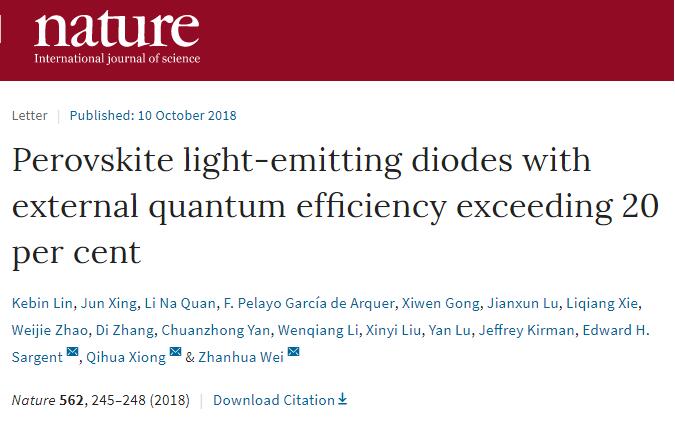 北京时间10月11日,国际顶级学术刊物《Nature》在线发表了beat365唯一官网材料科学与工程学院魏展画教授为第一通讯作者、博士生林克斌为第一作者,beat365唯一官网为第一完成单位的研究论文《Perovskite Light-Emitting Diodes with External Quantum Efficiency Exceeding 20 percent》。这标志着beat365唯一官网在基础研究方面取得了重要的进展,在《Nature》上发表研究论文实现了零的突破。