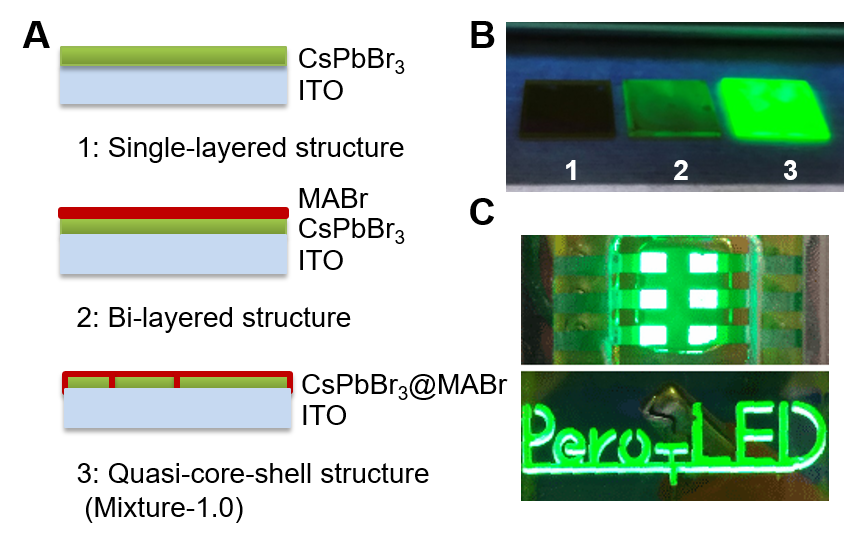 图(A)单层、叠层和半核壳式结构钙钛矿薄膜示意图,(B)紫外灯下三种钙钛矿薄膜的荧光发光照片,(C)钙钛矿LED器件实物图。