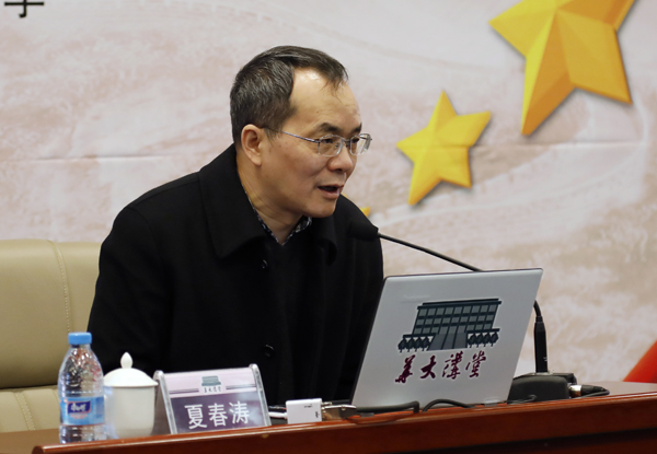 1月2日下午,“华大讲堂”第79讲在陈嘉庚纪念堂科学厅举行,中国社会科学院近代史研究所党委书记夏春涛作《高举旗帜,将改革开放进行到底》的专题报告,带来他对于习近平总书记在庆祝改革开放40周年大会重要讲话精神的思考与体会。