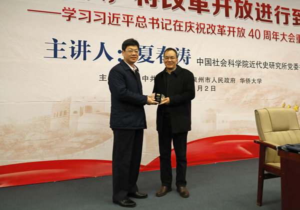 泉州市委书记康涛为夏春涛颁发“华大讲堂”主讲嘉宾纪念牌