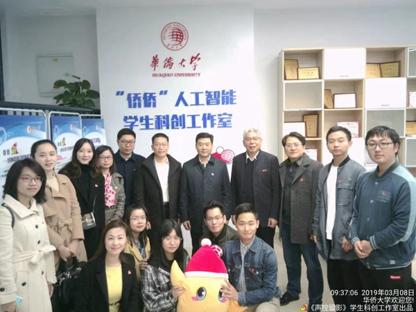 肖华鑫(中)一行体验“侨侨”人工智能学生创新工作室声控留影技术