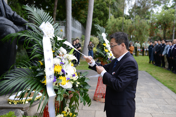 上午八时,国旗护卫队队员向廖公铜像敬献花篮,校长徐西鹏整理花篮上的缎带,并与校领导刘塨、刘斌、彭霈、毕明强,校长助理张云波,以及在场师生一起向廖公铜像三鞠躬。