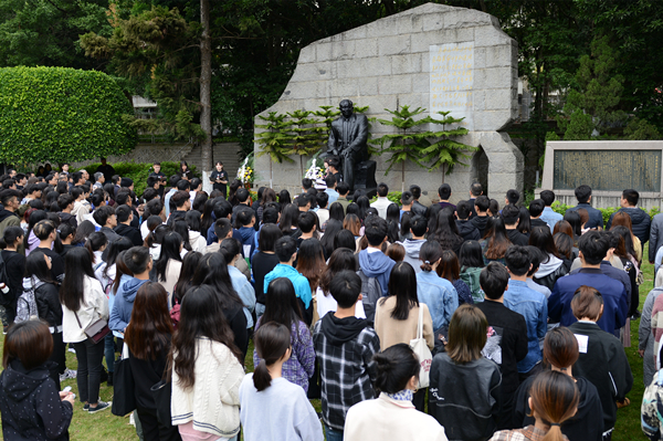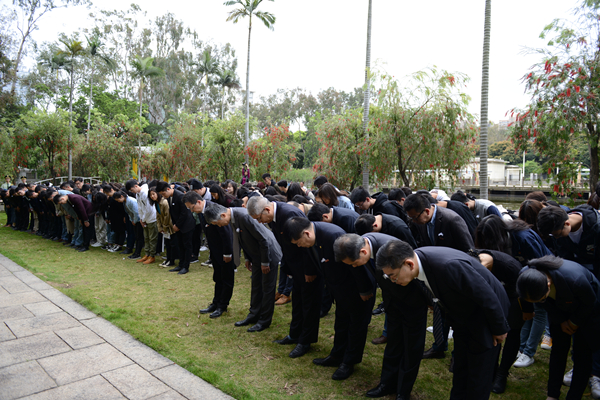 4月4日,清明前夕,秋中湖畔,beat365百余名师生肃立在廖承志铜像前,缅怀创校校长廖承志先生。