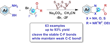 该方法通过串联方案以良好至优秀的产率获得了有价值的2-酰氨基/酯基取代的苯并咪唑、苯并恶唑以及苯并噻唑衍生物。机理研究表明,S8促进溴二氟乙酰胺/酯类化合物选择性裂解三个C-X键(包括上的两个惰性C(sp3)-F键),同时保持C-C键完整,使得溴二氟试剂充当了C2源。毫无疑问,该策略将进一步拓展卤代二氟化合物在合成上的应用,并丰富了氟化学和绿色化学的内容。