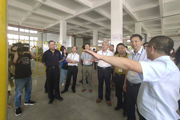 刘育生(右二)、陈建荣(右三)一行现场参观了基地研发中试车间